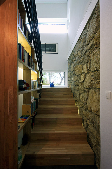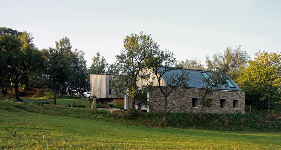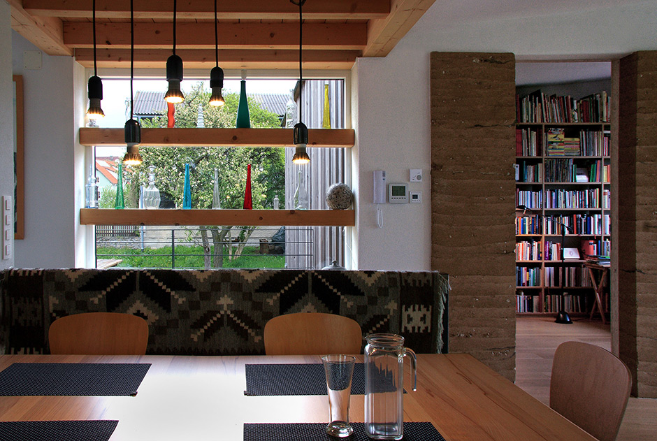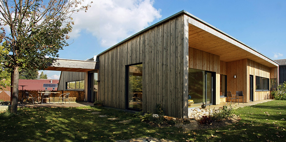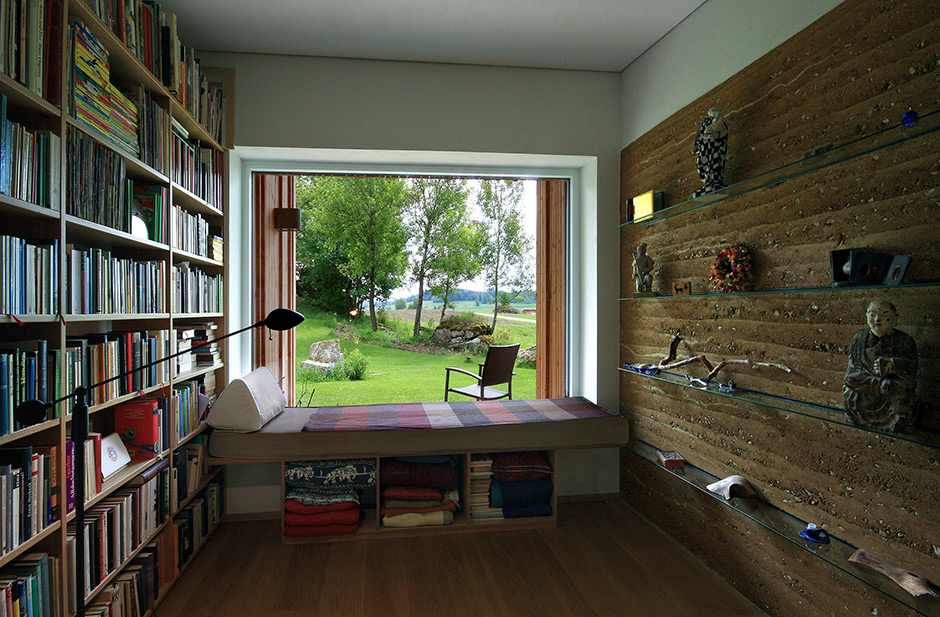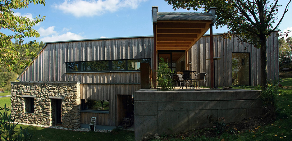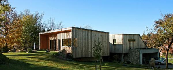 bei der ausbildung der baukörper und des grundrisses wurde einerseits großer wert auf die verbindung zwischen innen und außen gelegt und andererseits auf die gestaltung von freibereichen unterschiedlicher qualität und ausrichtung. so wurde der unverbaubare südblick in die angrenzenden felder und wälder entsprechend inszeniert und durch zwei, das gebäude durchziehende blickachsen ergänzt. rund um das haus, immer in küchennähe, befinden sich drei freibereiche: die ostseitige hofterrasse, die südseitige ausblicksterrasse und die westseitige abendterrasse.