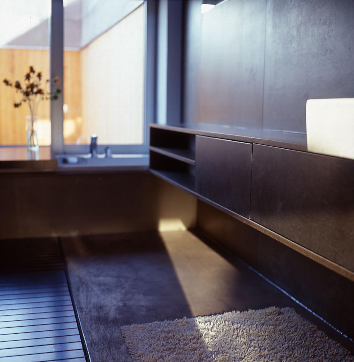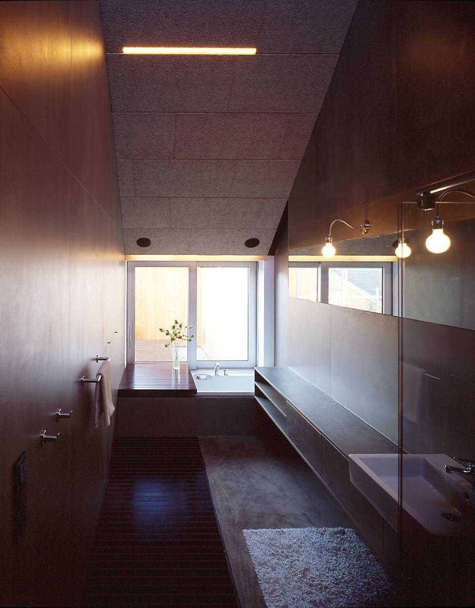 - - sämtliche tischlerelemente zeigen ungeniert ihre ungeschminkte „haut“, seien es sandgestrahlte mdf-platten im wohn-, schlaf- und küchenbereich oder zementgebundene spanplatten im nassbereich. letztere bilden beim abbindungsvorgang besonders eigenwillige oberflächenstrukturen aus; als material für badezimmerschrank und verkleidung sind sie eine – extrem kostengünstige – novität und belegen die experimentierfreudige partnerschaft von bauherr und architekt.