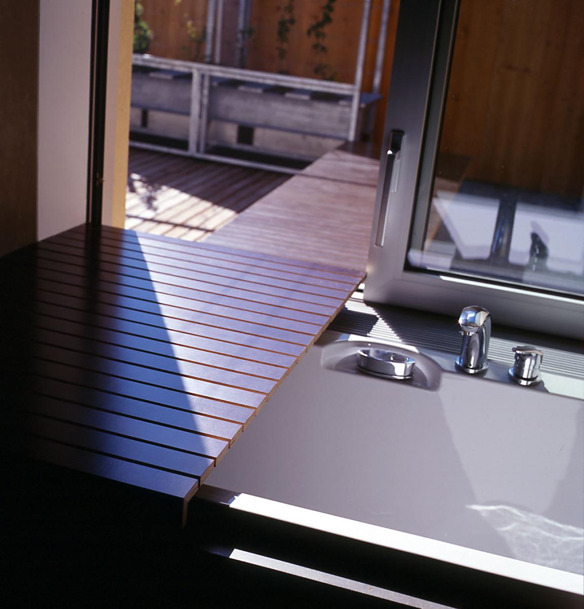 recht offen gestaltet sich hingegen die beziehung zwischen wohn- und außenraum. ein abnehmbarer holzlattenrost über der badewanne, gedacht als sitz- und ablagefläche, findet, nur durch das fensterglas getrennt, seine fortsetzung als sonnenbank auf der terrasse.