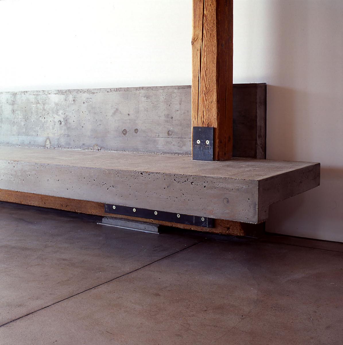 - - im wohnschlafbereich lädt eine raumprägende bank aus sichtbeton zum gemütlichen verweilen. sie wird durch die schläuche der fußbodenheizung erwärmt und ersetzt so einen kachelofen. ihr exakter baukörper offenbart bei näherer betrachtung einschlüsse und betonnester, der kantenverlauf ist nicht auf linie geschliffen. derartige „fehler“ sind durchaus erwünscht, setzen sie doch die grobporige oberflächenbeschaffenheit der gespärre fort.