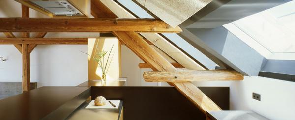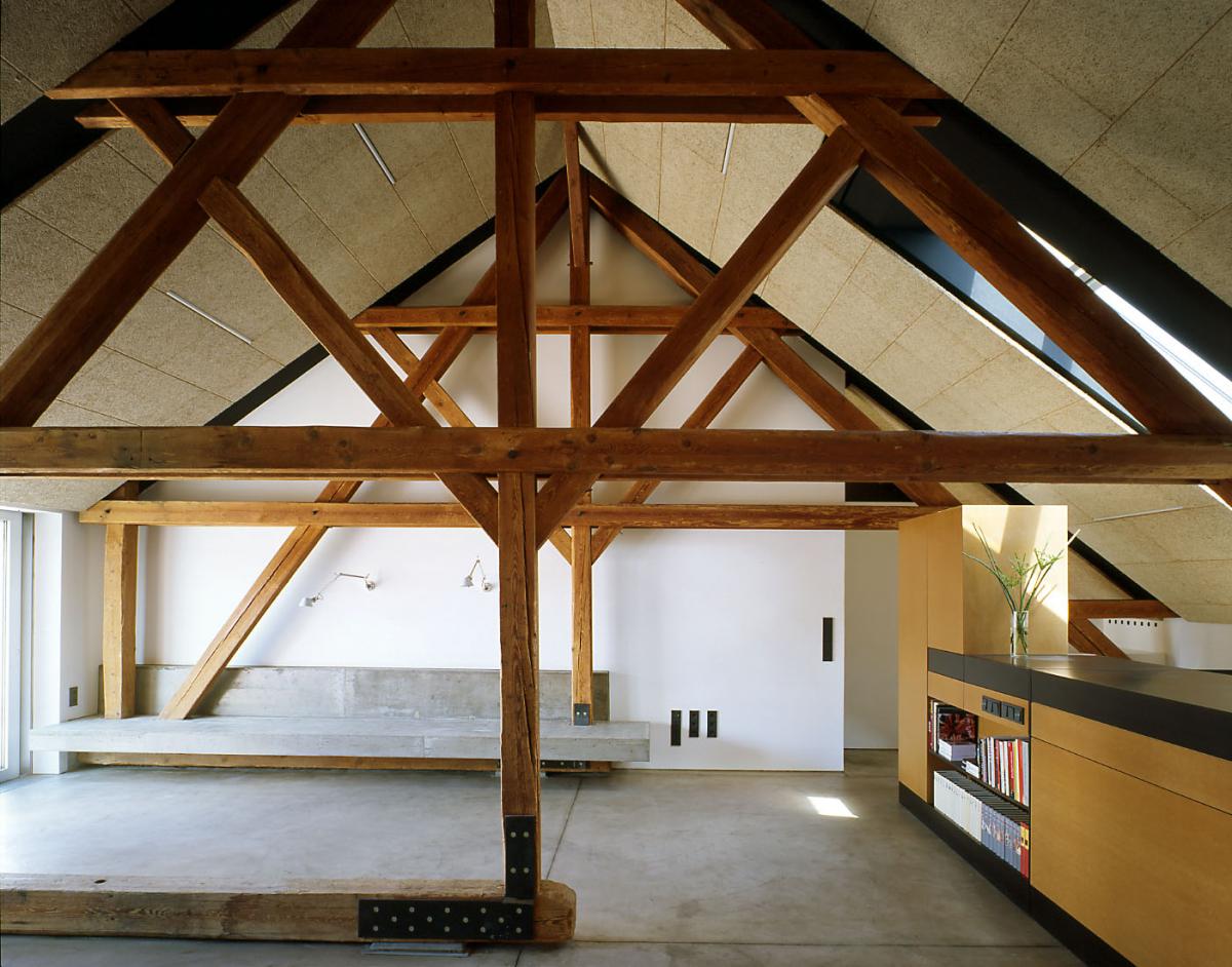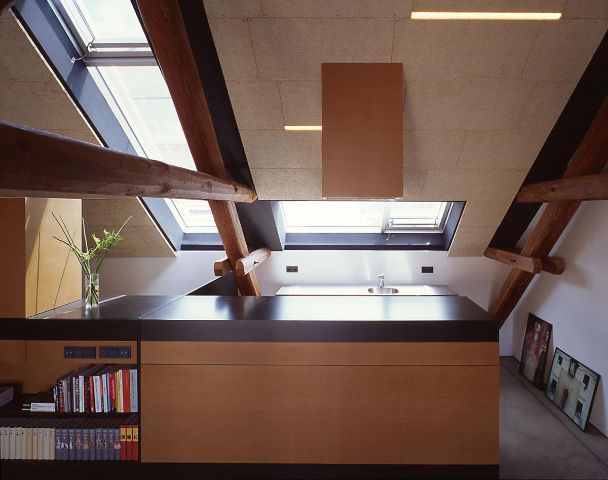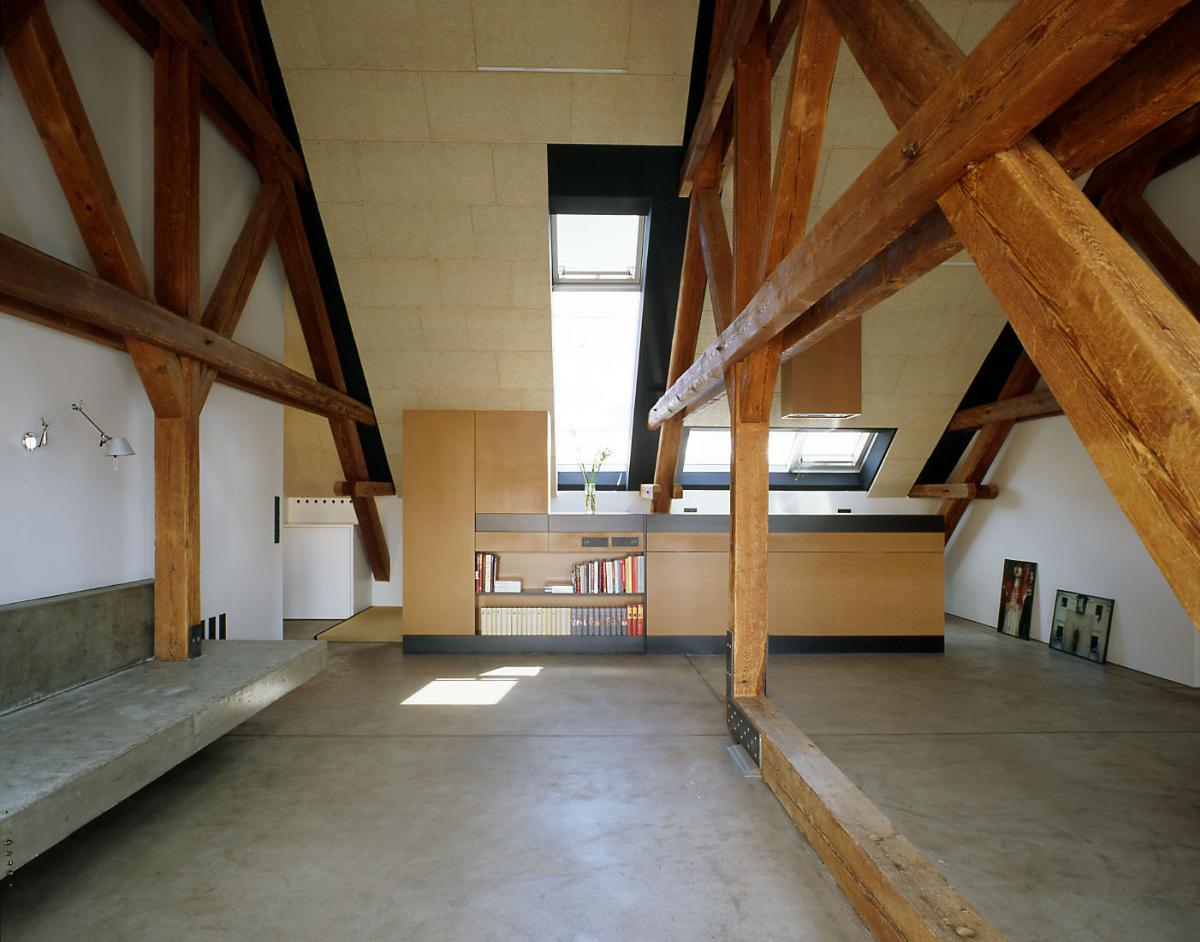 im dezember 2000 bat er architekt di horst zauner, eine raumlösung für den insgesamt 160 m2 großen dachboden zu entwickeln, dessen bestimmende elemente – die gespärre (vulgo „binder“) des dachstuhls – eine beeindruckende skulpturale kraft entfalten. der raumquerschnitt und die statische beschaffenheit des bestandes ließen glücklicherweise einen umbau ohne eingriff in die substanz zu. die kniestockhöhen waren ausreichend, die decke bedurfte keiner verstärkung, die gespärre konnten unverkleidet bestehen bleiben. der einreichplan sah noch den ausbau des gesamten dachbodens vor, die hälfte (rund 80 m2) wurde tatsächlich als wohnraum neu adaptiert, wobei einer künftigen ausweitung der wohnfläche nichts im wege steht.