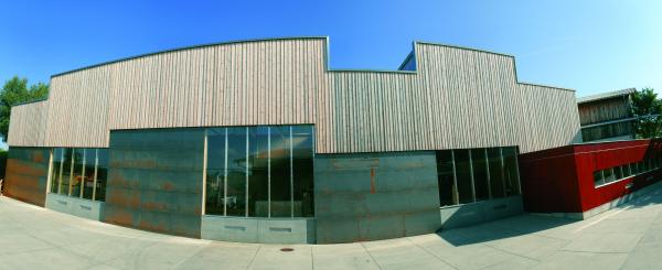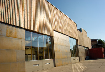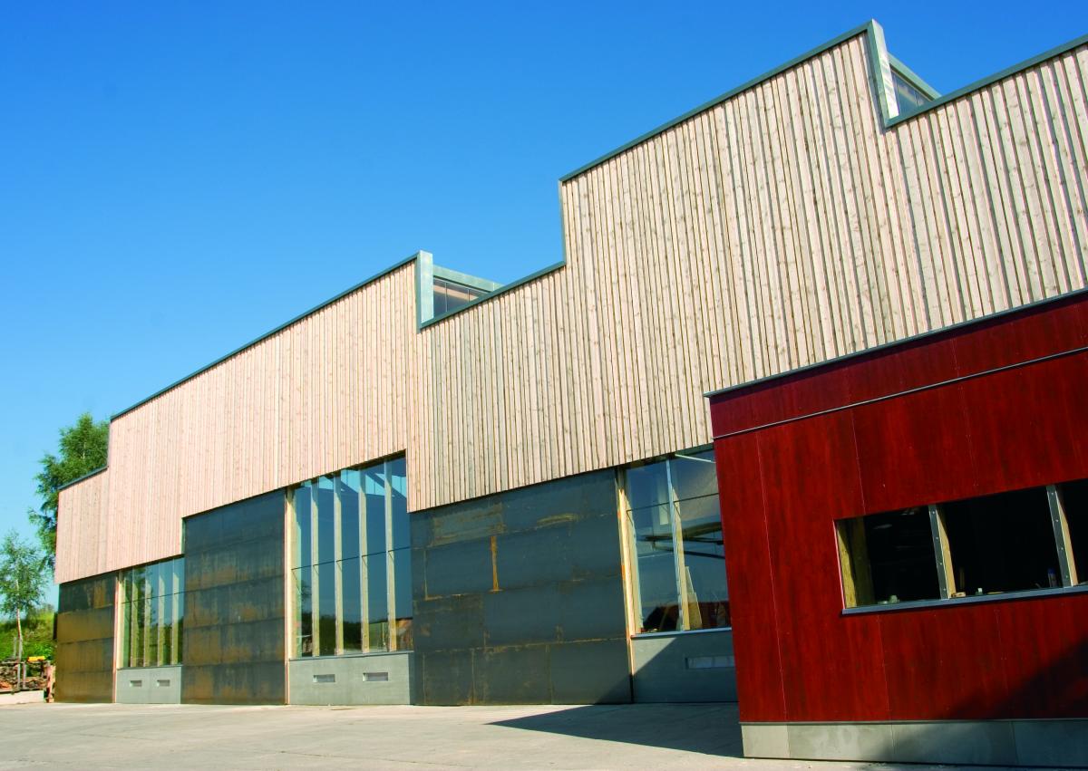 Die beiden Baukörper sollen entsprechend der Tätigkeiten, die in ihnen ausgeführt werden, unterschiedlich in Erscheinung treten: Die große Holzbauhalle in einer gewissen Rohheit, die Handwerkstatt proper.